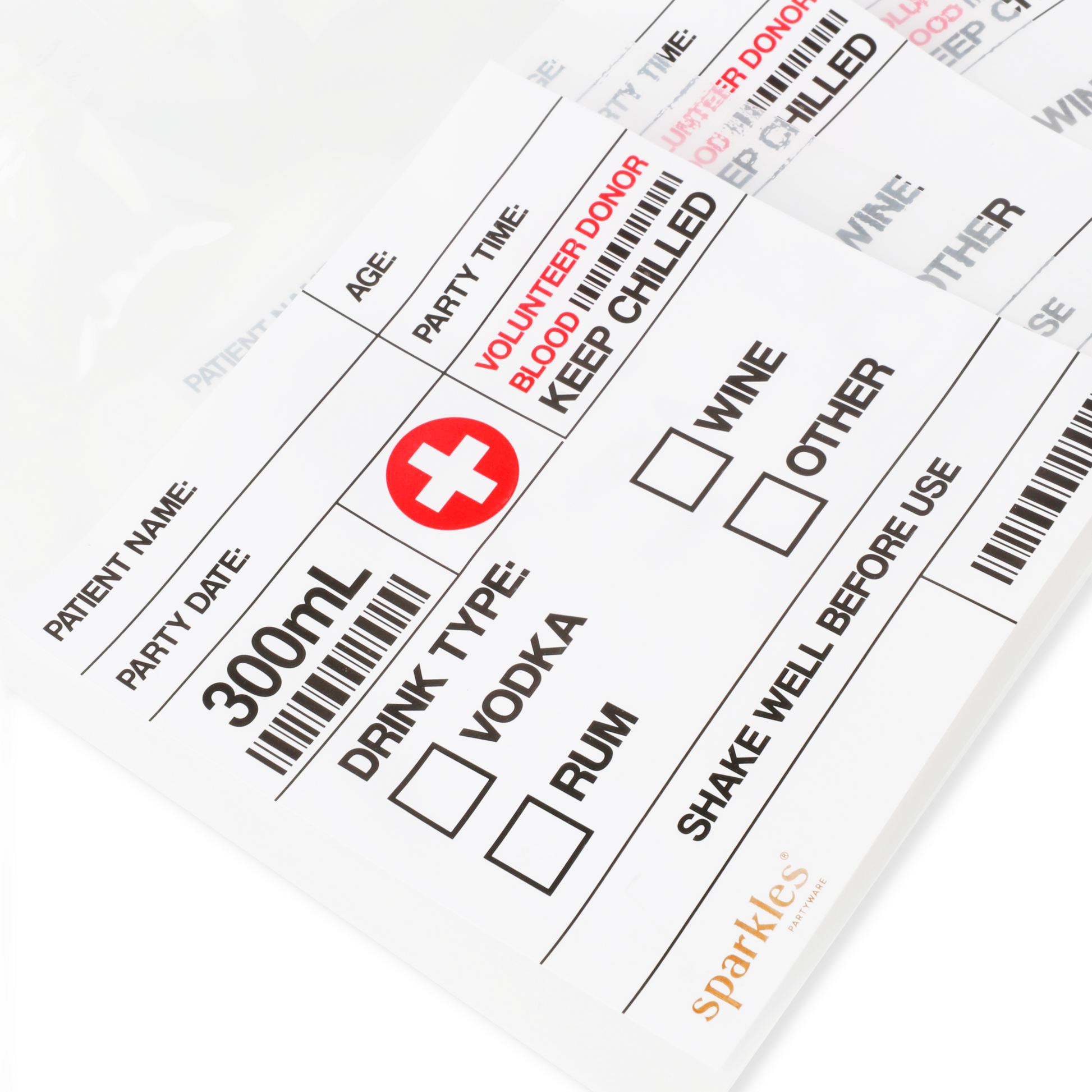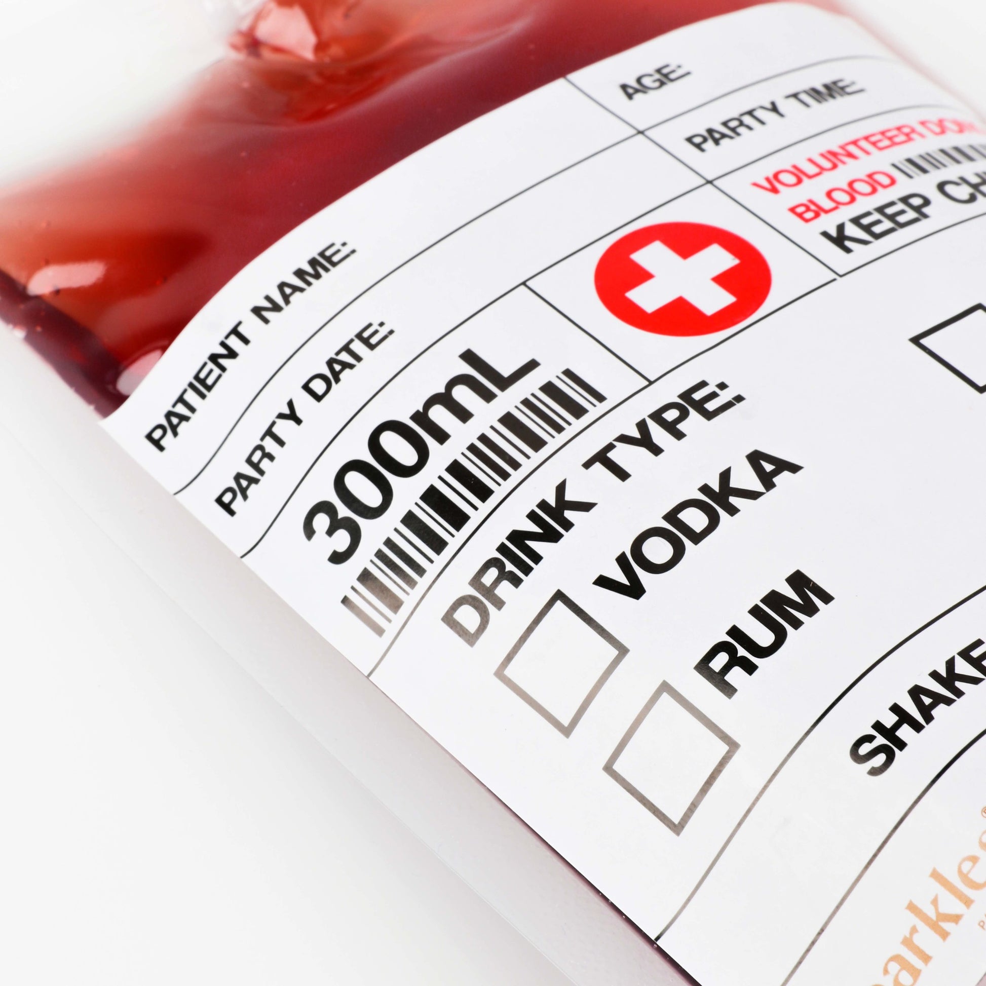- SET - You will receive a set of 5 blood bag drink pouches with labels that can be customised along with 5 black paper straws.