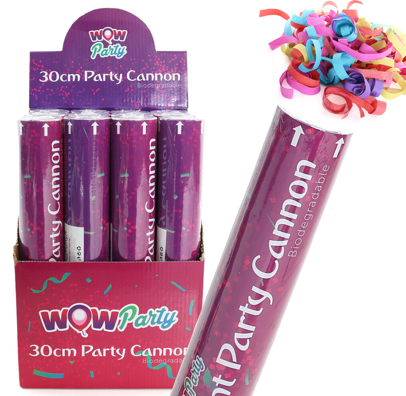 - 30cm Confetti Cannon with multicoloured biodegradable and environmentally friendly confetti.