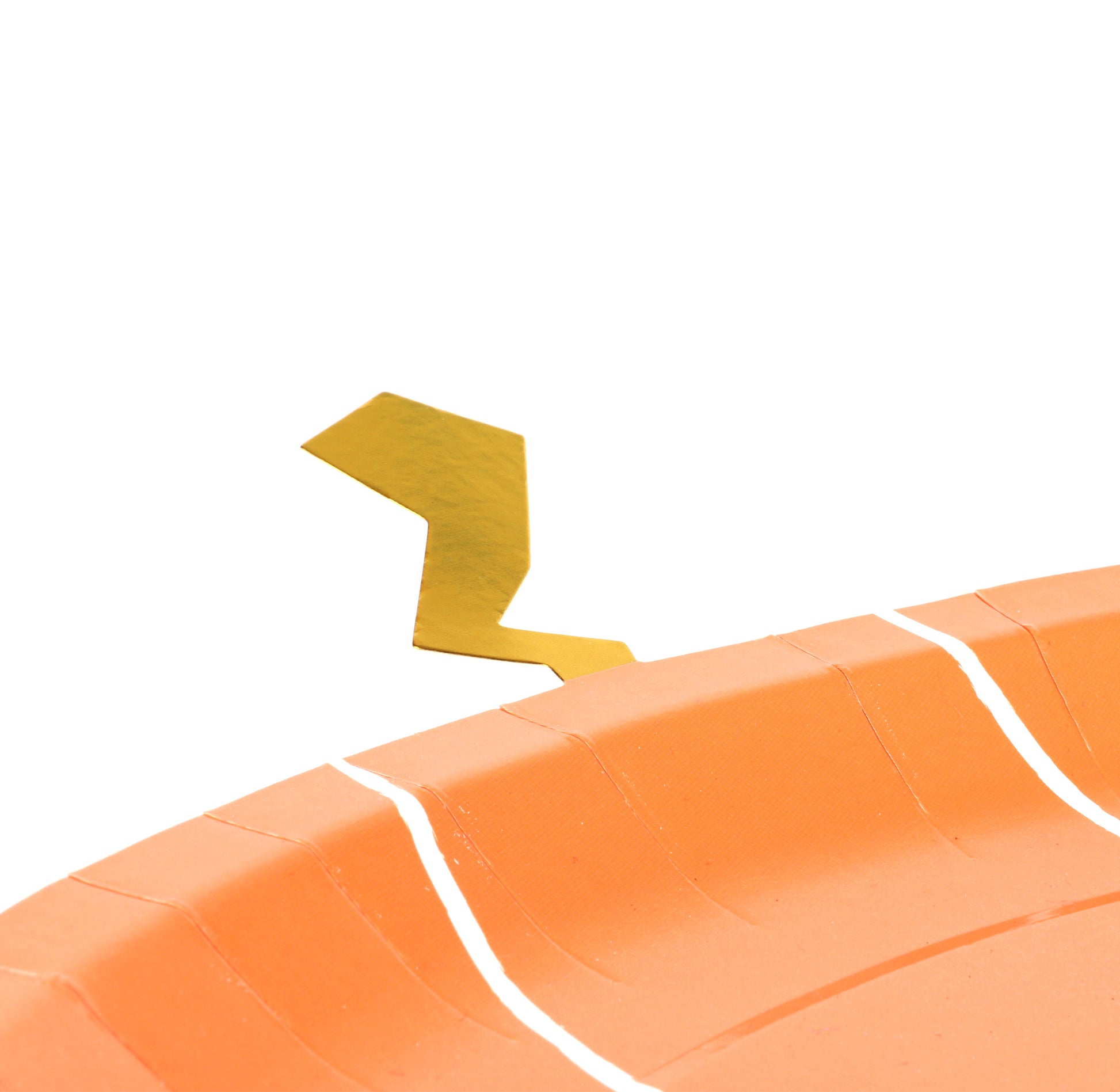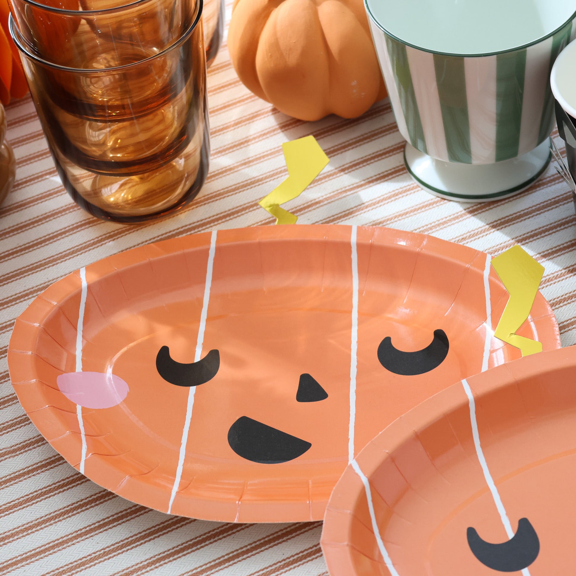 - WHAT YOU WILL RECEIVE - A pack of 10 vibrant orange pumpkin shape 9 inch (approx 23cm) paper plates with a face design print with pink foil cheeks and a gold foil stem.