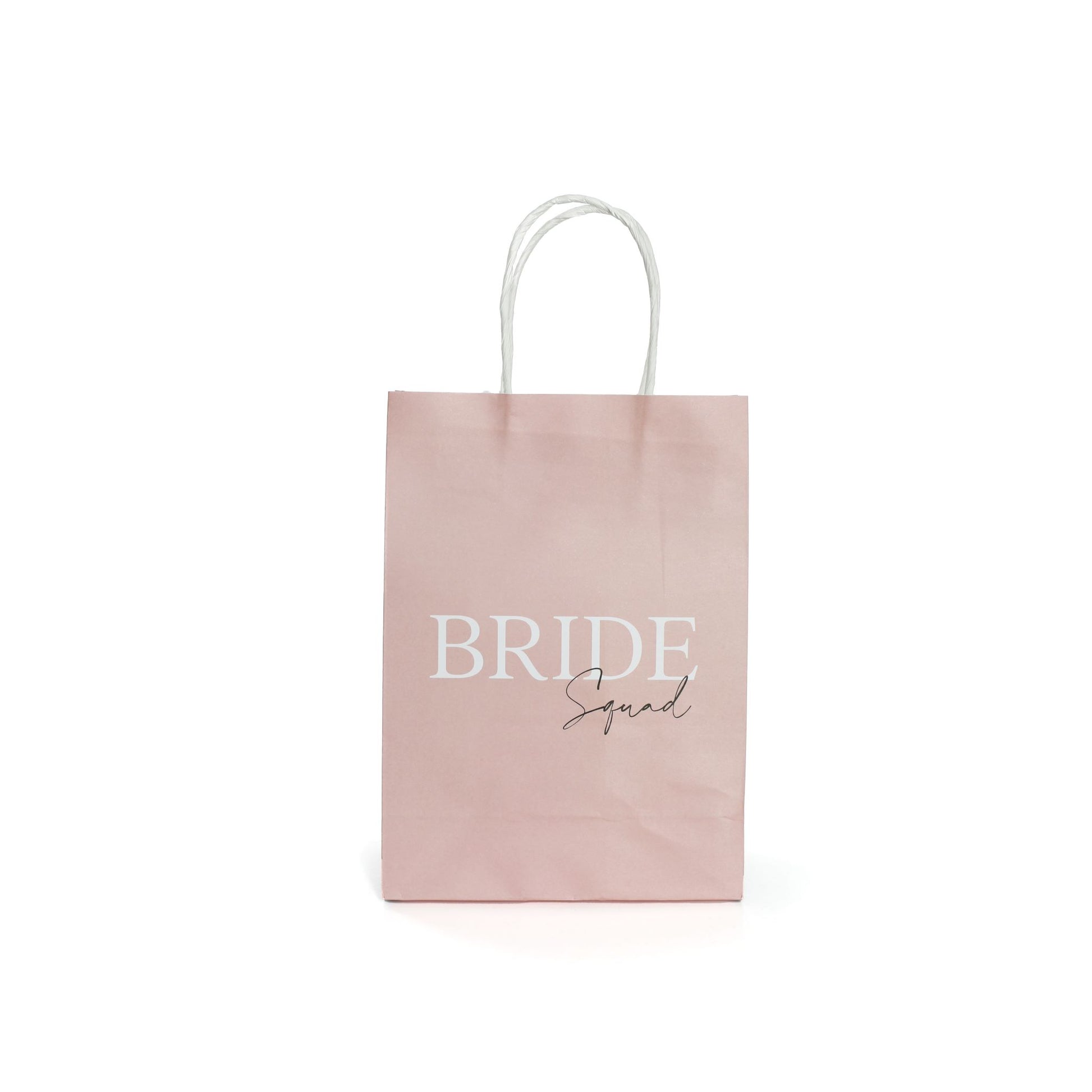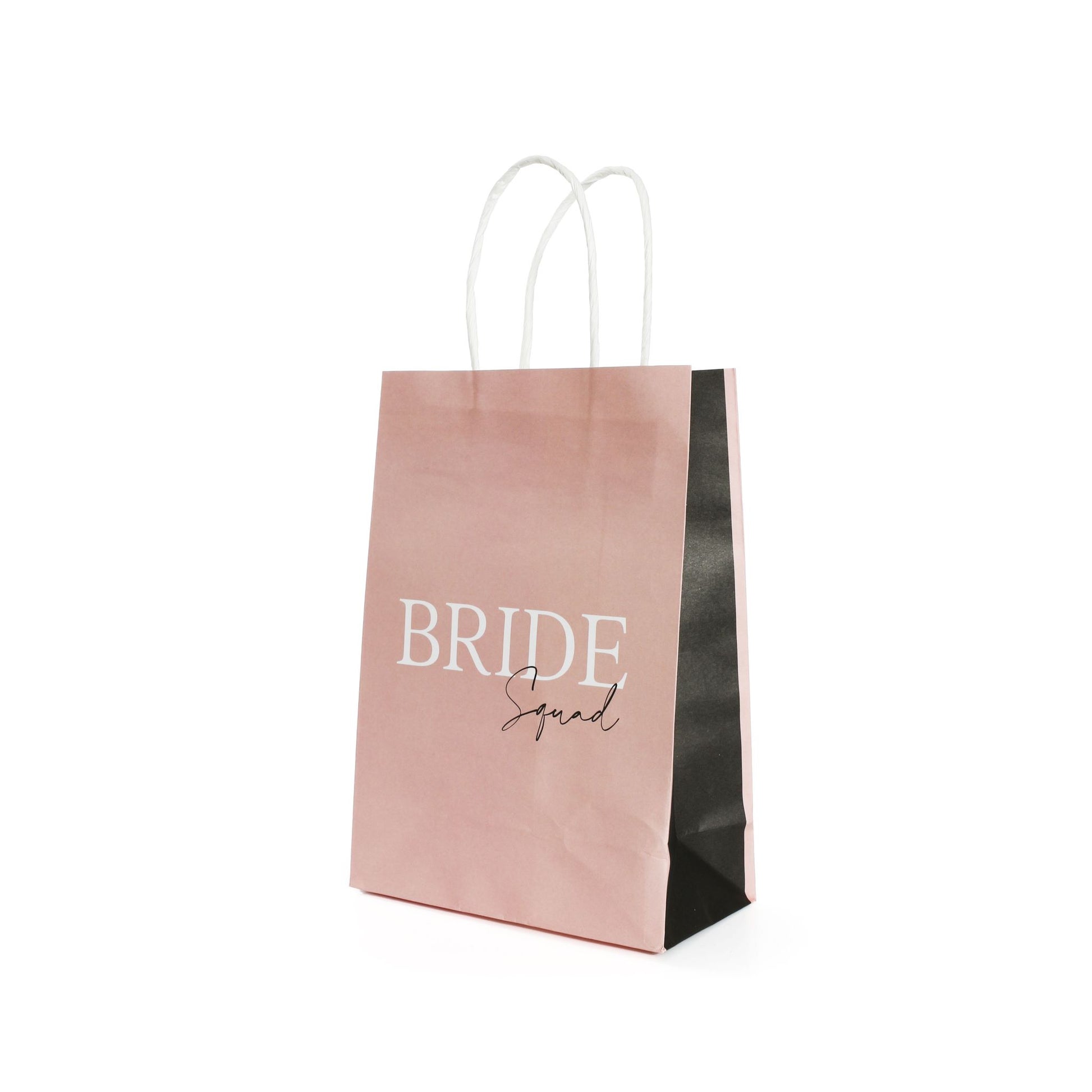 - Hen Party Bride Squad design paper bags. Pink colour with text.