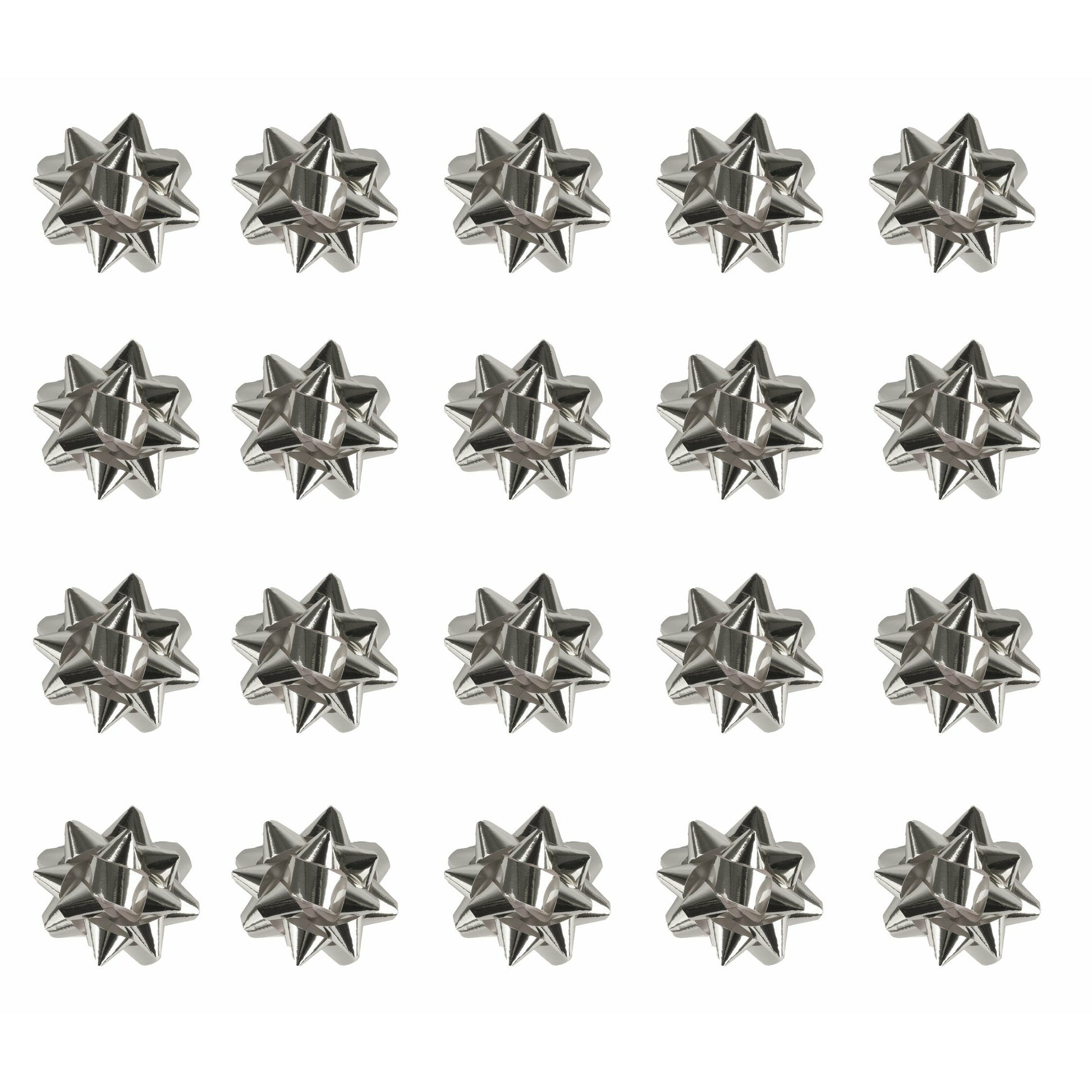 - Pack of 20 Medium Shiny Metallic Foil Decorative Bows in Silver only.