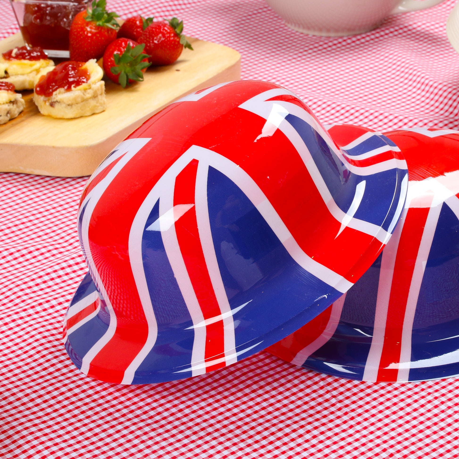 - UNION JACK PLASTIC BOWLER HATS: Perfect addition to use and celebrate for the King's Coronation, VE Day, Street Parties and any British themed event or Sporting Event.